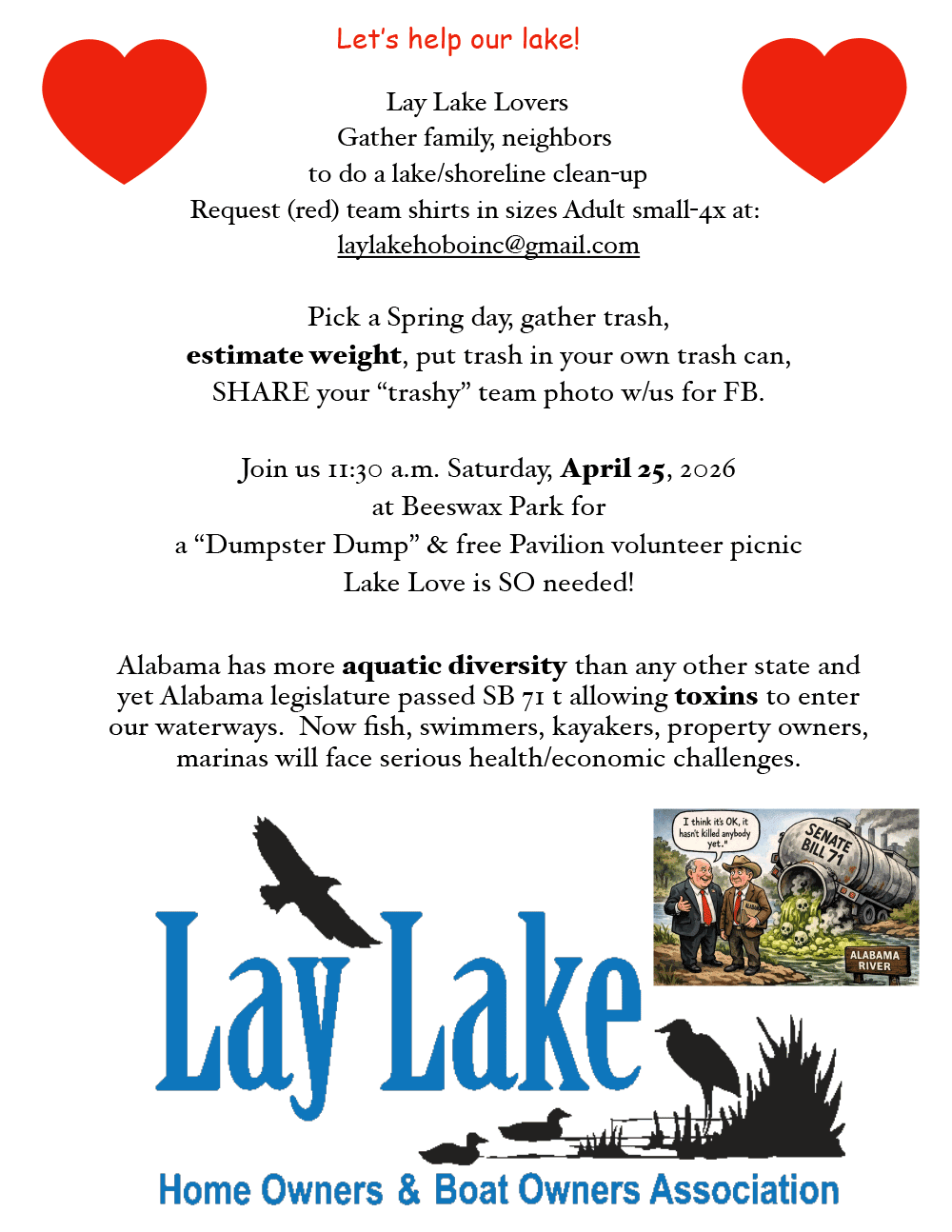 Alabama has more aquatic diversity than any other state and yet Alabama legislature passed SB 71 t allowing toxins to enter our waterways. Now fish, swimmers, kayakers, property owners, marinas will face serious health/economic challenges.